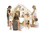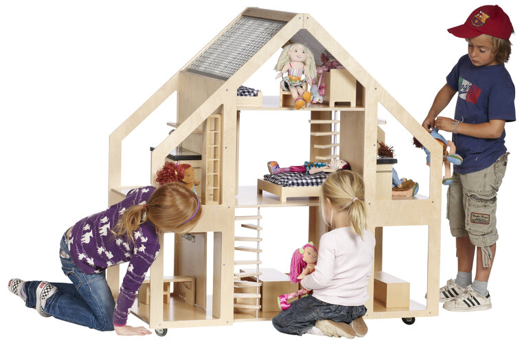 Verrijdbaar houten poppenhuis met interieur. Duurzaam ontwerp van Liliane. Geschikt voor grote poppen, direct speelklaar en ideaal voor professioneel gebruik.
