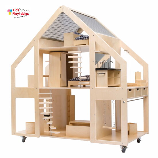 Verrijdbaar houten poppenhuis zonder interieur. Duurzaam ontwerp van Liliane. Geschikt voor grote poppen, ideaal voor professioneel gebruik en inrichting naar wens.