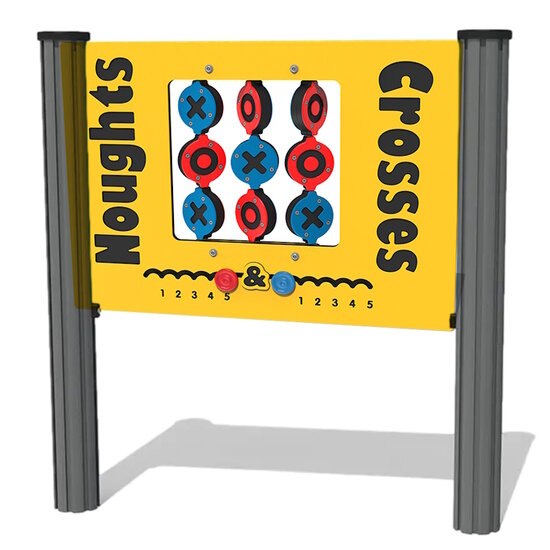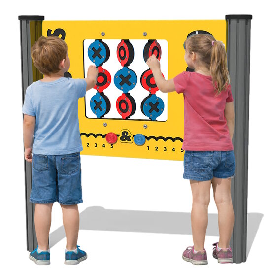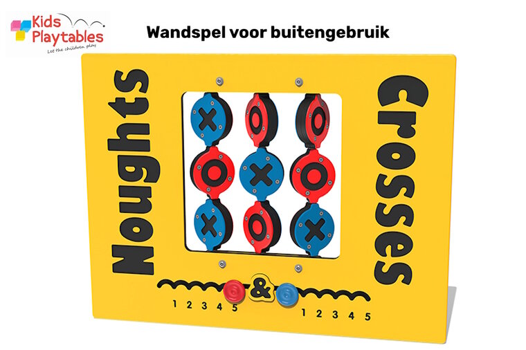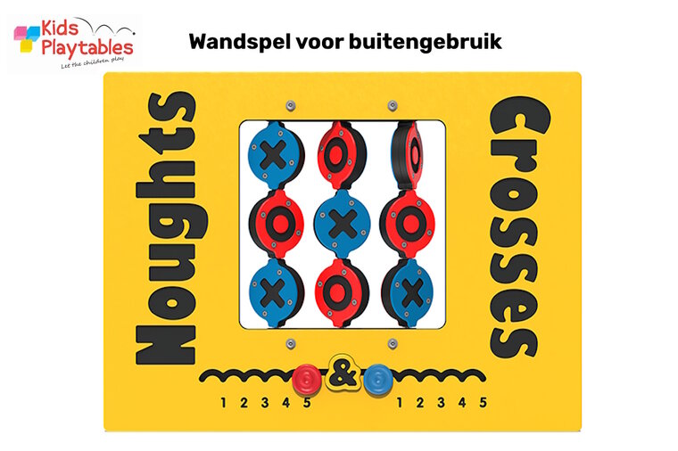 Wandspeelbord voor buiten "Boter, kaas en eieren geel" van Kidsplaytables is speciaal gemaakt voor permanent buitengebruik op de speelplaats. Dit wandspelpaneel bevorderd de creativiteit, inzicht en fantasie van kinderen en is ideaal voor de buiten-speeltuin of op het schoolplein te spelen. Dit wandspel is een moderne variant op het welbekende boter-kaas-en-eieren spel.