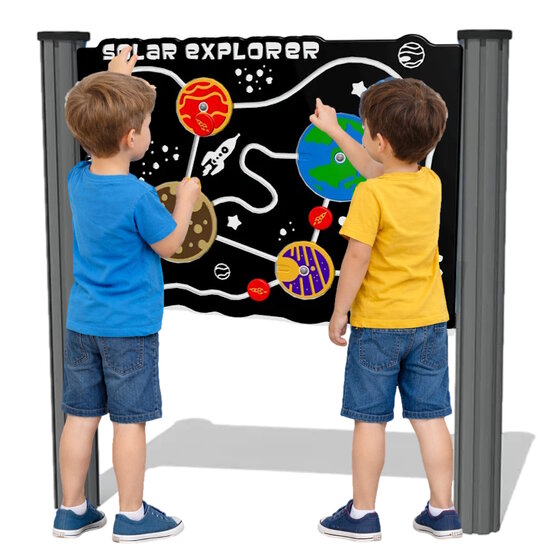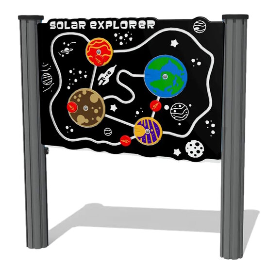 Wandspeelbord voor buiten planeten verkenner van Kidsplaytables is speciaal gemaakt voor buitengebruik op de speelplaats. Met dit wandspel voor buitengebruik kunnen de Kinderen de balletjes van planeet naar planeet laten reizen door aan de planeten te draaien. Maak je klaar voor een mooie ruimtereis.